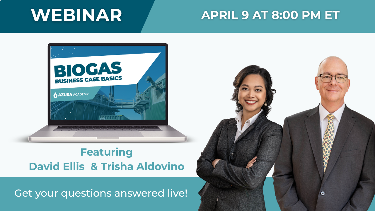 Get your biogas project feasibility questions answered in this live session!Ā Join Azura's David Ellis and Trisha Aldovino as they discussĀ the business fundamentals of anaerobic digestion (AD) and renewable natural gas (RNG) projects. This course will empower you to be an informed stakeholder and teach you to ask the right questions to determine if a biogas project is worth pursuing.